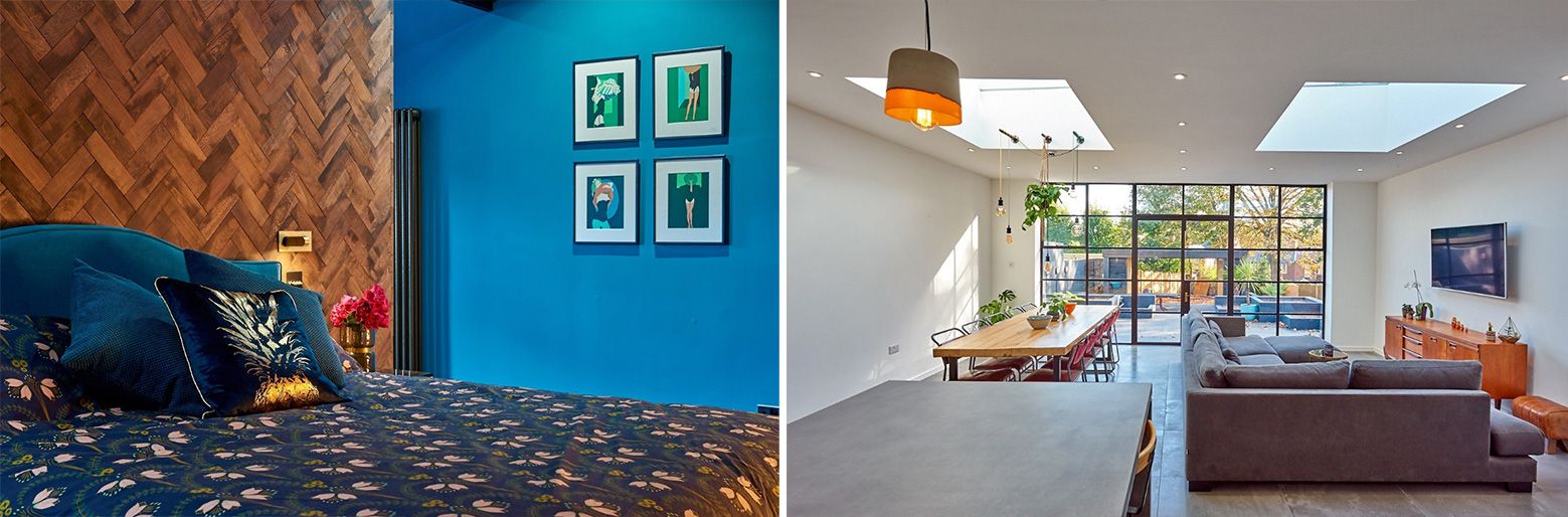 The master suite is a real sanctuary and we designed it with a boutique hotel in mind. The parquet wall provides texture and warmth and the contrasting teal and blush pink paint is really striking.