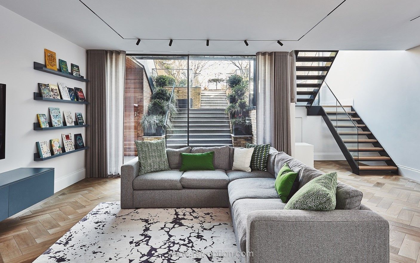Where to begin with our next property? Once you see Lotus you’ll be clambering to shoot there! The South London family home is packed to the rafters with truly immense standout features that make for a perfect shoot location whatever your needs. Set over four floors, the property is finished with a striking parquet flooring throughout, however, the main attraction points come from the crittal windows and dividers found across the extension at the back, the lavish wine cellar and the striking differences in palette from room to room. If we move to the original front of the property, there is a completely different style, nevertheless, it works just as effortlessly. Check out the juxtaposition between the tiled landing that is set against a pastel green colour palette and the modern minimalist kitchen with its clean and fresh white interior.