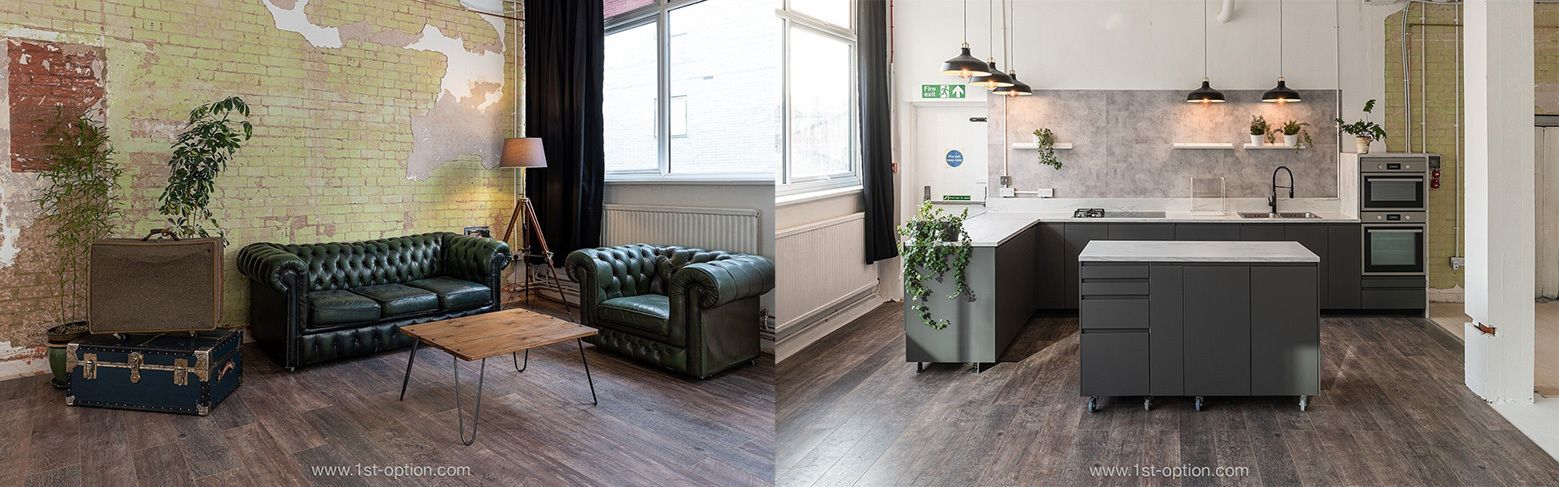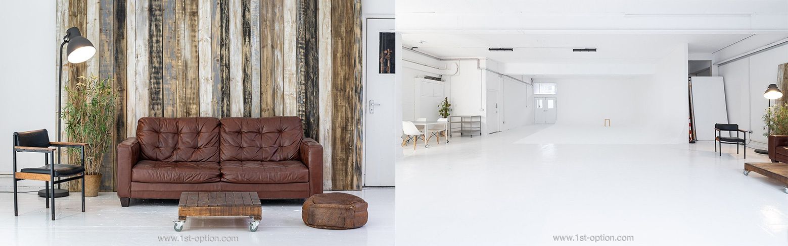 Next up are two studio spaces, both offering something different. One is styled while the other is bare, allowing for decoration to accommodate any shoot. Drops Studio 1 is an all-purpose studio that blends the blank elements of a blackout studio, with styled components, making for a remarkably creative set. The styled aspects cross between a premium kitchen space and a more distressed and worn area. Within the kitchen area expect to see wooden flooring and a marble effect countertop, while in the distressed area you’ll find exposed brick, worn concrete and retro furniture – allowing for tons of unique shooting opportunities! There is also an infinity cove and hair and makeup area, making it perfect for headshot shoots. Drops studio 2 offers the exact opposite to 1. It is largely made up of blank canvases and a substantial infinity cove. There is only one small styled area, where you’ll find a vintage sofa and wooden paneling behind it. The rest is up to you!