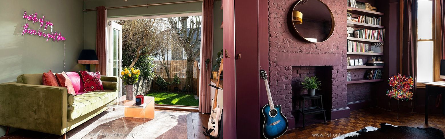 Looking for something a bit more quirky and unusual? Then Fig in Kensal Green is the property for you. Once you pass the unassuming front of the flat you are met with a spectrum of colour, character and charm. From the terracotta hallway, to the soft pink ceiling and the crushed velvet furnishings, you are never short of fascinating shoot opportunities. The pink neon sign found here also brings splashes of fun to the space. Every room offers something quite different to the next and this is typified through the two bedrooms. The first is finished with a tranquil blue aesthetic and features even more crushed velvet, a statement shell bed and retro style furniture. The second bedroom however, screams moody private members club. This is elevated through mustard and gold tones, juxtaposed by the overarching purple colour palette. Of course, a property like this couldn’t be finished without a garden to match; the weeping willow outside goes some way to achieving this. Due to its size we wouldn’t recommend filming, but editorial shoots would be perfect here!