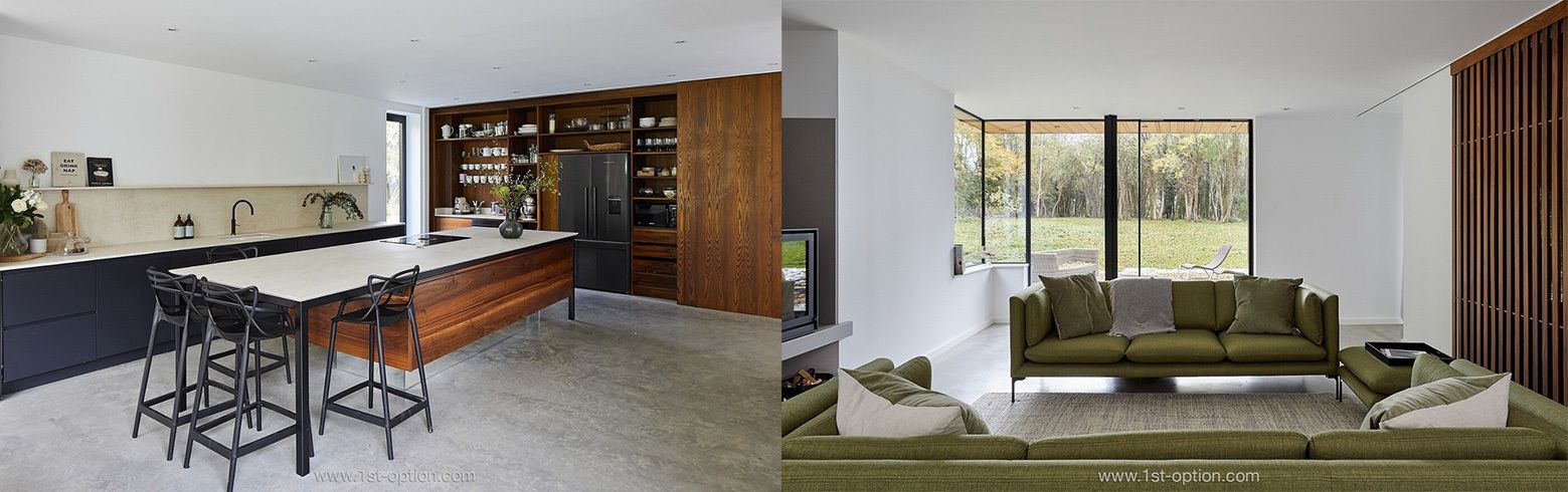 Moving on, we give you Treehouse, an extremely unique, modern new build with a whole host of incredible features. The first of these unmissable features is the larch cladding, found on large parts of the exterior, the adjoining glass walling and its flat roof. They are incredibly compelling and grab attention right away. Once inside, you are met by an interior to match! Thanks to the huge glass walling, the property gains a wealth of natural light, which beautifully compliments the fresh minimalist aesthetic. On the ground floor is the open plan kitchen and living space – featuring a concrete floor, gorgeously rich wooden furnishings and a large kitchen island. This is complemented by the main living space that also benefits from huge glass walling, a truly remarkable wood burning stove and an immensely unique sliding wooden shutter, reminiscent of those seen in box office films. Based in the woodlands of Kent, (perfect for filming and editorial shoots) Treehouse will no doubt be a fan favourite for long to come!