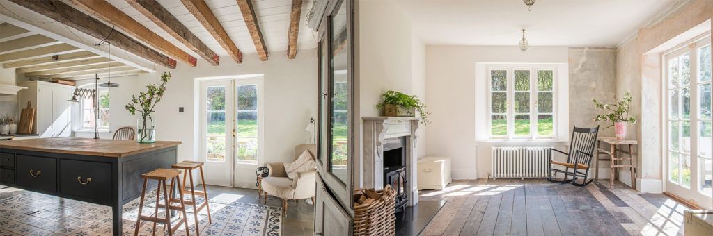 First up is Brook Lodge, a fabulous red-brick country house, set within 1 acre of glorious land. The property benefits from a breathtaking rustic aesthetic that is perfectly complemented by the sum of its parts – aged wooden floorboards, eye-catching wooden beams and subtle touches like the wooden table, dresser or log burner. Some of the other notable features come from the striking antique tiled floor in the kitchen and the distressed plaster wall found downstairs; two touches that give Brook Lodge its overarching country chic feel. We can’t talk about this property without mentioning the eye-catching tennis court, a staple for any country house, giving you endless eccentric shooting opportunities. Thanks to its size and range of areas to shoot within, we believe Brook Lodge to be perfect for filming as well as large scale editorial shoots.