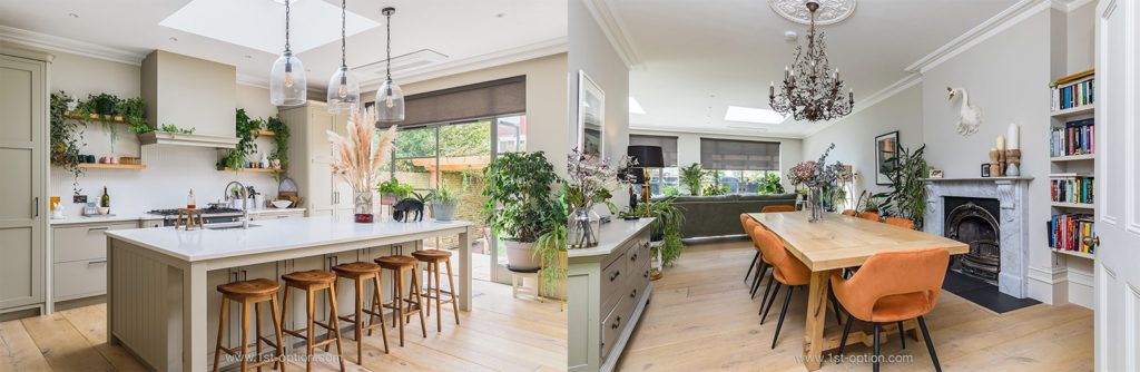 Moving from London to Brighton and Hove, our next shoot location is Phoenix, an outstanding detached 5 bed location house a stone’s throw from Hove seafront. This gorgeous property showcases a striking kitchen/ living/ dining room, finished in neutral olive tones with crittal windows, wooden flooring, a huge central island plus oodles of natural light that immerses the space, allowing for the biophilia to thrive. It is here (within this glorious kitchen) that the interior opens out to the generous terrace, overlooking a luscious green garden, finished with an eye-catching plant-covered pergola offering sheltered seating for up to 12. The front of the property boasts large rooms with period features including high ceilings, architrave, dramatic bay windows and an original fireplace with wood burner. The house is stylish and tasteful, yet welcoming, thanks to an array of beautiful plants that soften the space. If this wasn’t enough, there is also a basement where you’ll find a furnished vintage bar/mini night club, with disco ball and dart board, so there’s a little something for everyone.